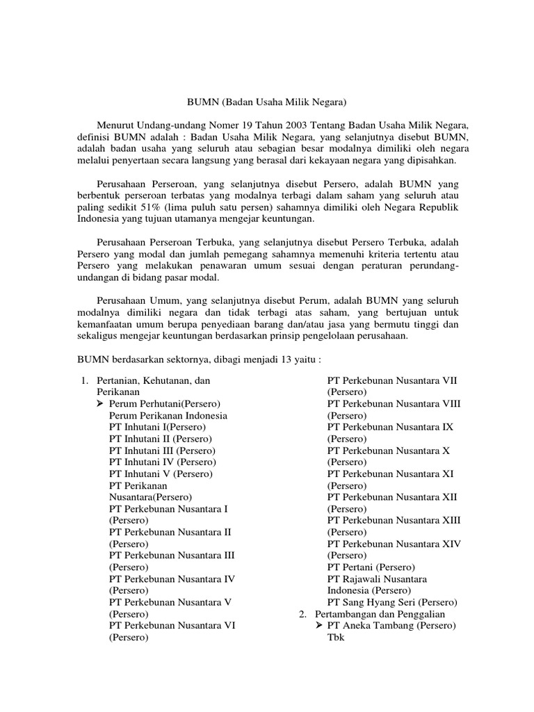 Negara, yang selanjutnya disebut bumn, adalah badan usaha yang seluruh. Lalu, aturan hukum yang mengatur adalah uu pasar modal. Seluruh entitas bumn berada di bawah pengawasan dan pengelolaan kementrian yang diketuai oleh menteri bumn berdasarkan penunjukkan oleh presiden. Perusahaan bumn memang milik negara dikarenakan seluruh atau sebagian besar modalnya dimiliki oleh negara. Perusahaan umum adalah bumn yang seluruh modalnya dimiliki oleh negara dan tidak terbagi atas saham, yang bertujuan untuk kemanfaatan umum badan usaha milik negara atau bumn merupakan suatu unit usaha yang sebagian besar atau seluruh perjan adalah bentuk badan usaha milik.